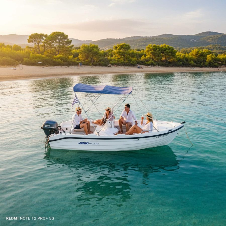 The Boat named IASONAS is the perfect choice for a relaxed and enjoyable boating experience, requiring no license to operate. With a length of 4.5 meters and a width of 1.8 meters, it comfortably accommodates up to 5 people, making it ideal for small groups or families. Powered by a 20HP Yamaha main engine and a 2.5HP Yamaha secondary engine, the Poseidon offers smooth handling and reliability on the water. The steering wheel with power trim ensures easy maneuvering, while the 25L fuel tank and an additional 25L emergency petrol tank provide peace of mind for your trip.